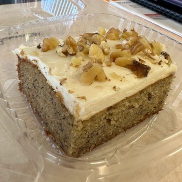 Home-baked banana cake with cream cheese frosting and chopped walnuts.